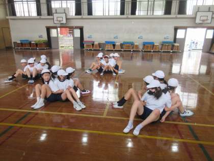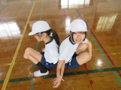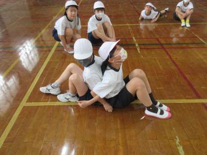 体育で、体ほぐし運動を行いました。背中を合わせて一斉立ちをしました。うまく立つために心を一つにしていました。