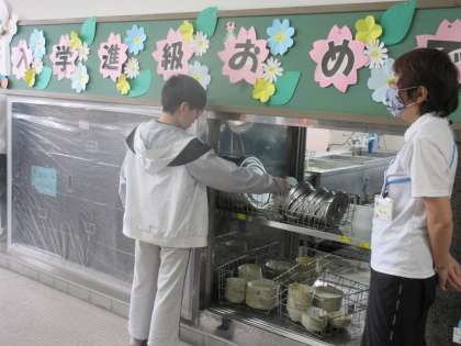 給食時間に献立の放送をしたり,昼休みに給食室で片付けの手伝いをしたりしました。