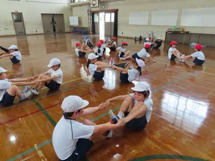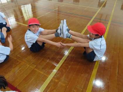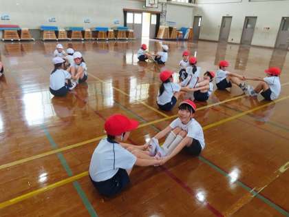 「体ほぐし」体育の学習の初めに「体の調子を整える活動」をしています。体をほぐす運動には、どんなものがあるのか子どもたちからでた意見を取り入れて活動しました。
