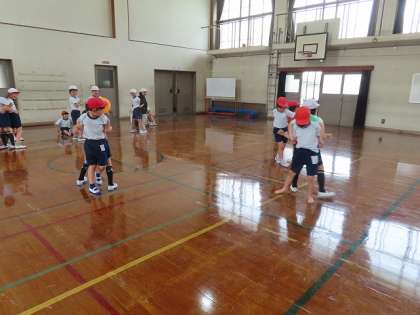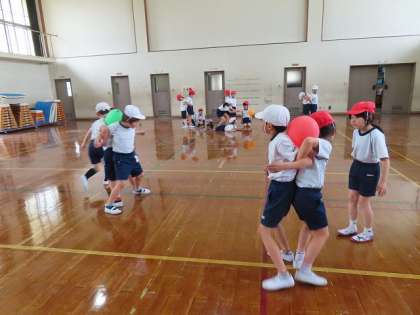 風船を背中に挟んで友だちと協力しながらリレーを楽しみました。途中から、そばに行って応援が始まりました。