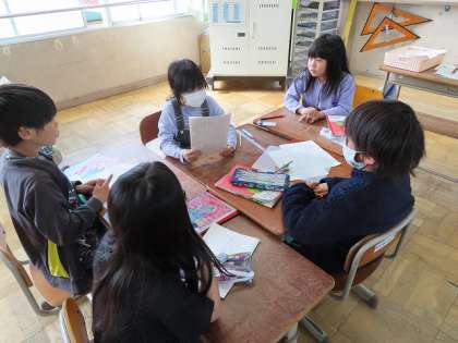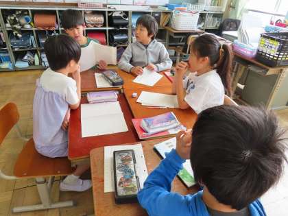 「春風をたどって」主人公のルウは、ノノンのことをどう見ているのかな、ルウの気持ちが分かる文章を見つけて友だちと交流しています。「ため息をつきました」「足を止める気配はありません」など、したことや言ったことを表す言葉、「さわやかな花のかおり」「ゆらゆらと踊るように」など場面の様子を表す言葉を見つけました。