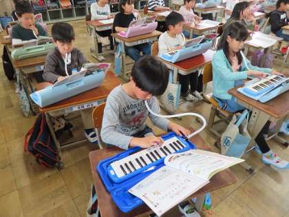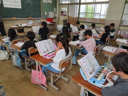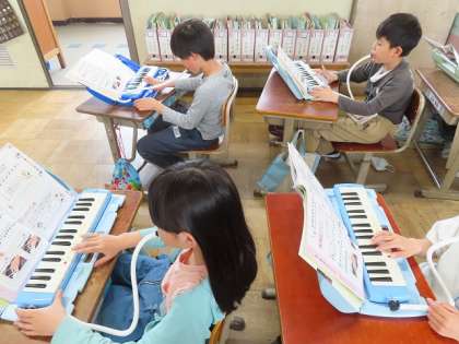 けんばんハーモニカを使っての学習をしています。高い方の「ド」から順番に小指、薬指、中指、人さし指、親指の後、中指を「ミ」の音に運び「レ」「ド」と弾く練習を何度もしています。