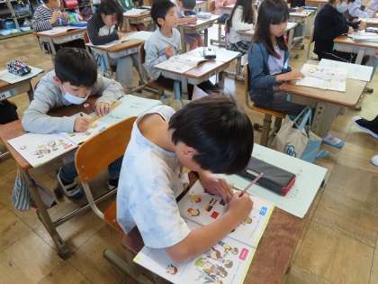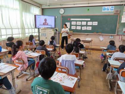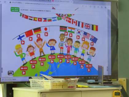 「あいさつをして友だちになろう」今日の学習では、前回のいろいろな国のあいさつを聞いて国と国旗と結び付けて確認したり、自分の名前をあいさつに入れて紹介する活動をしました。