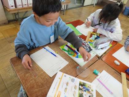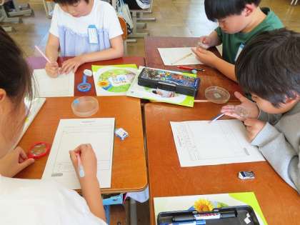 「種を観察しよう」ゴールデンウイーク明けに「ひまわり」と「ホウセンカ」の種をまきます。今日は、虫めがねを使って「形」「色」「大きさ」をしっかりと観察することができました。