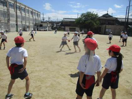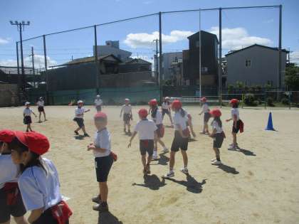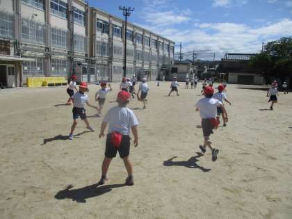 運動場では、しっぽとりのゲームで体をほぐしました。
