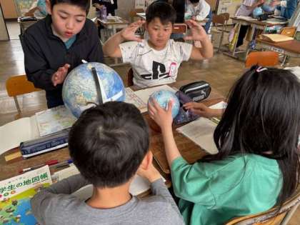 地図帳の世界地図と地球儀の世界地図を見比べて気付くことを話し合いました。