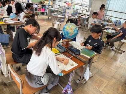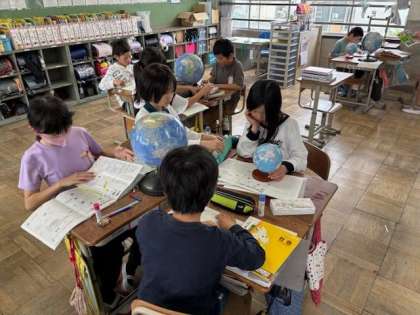 地球儀や地図帳を使って日本が世界のどの位置にあるのかを調べました。六大陸と三海洋など、大切な用語も学びました。