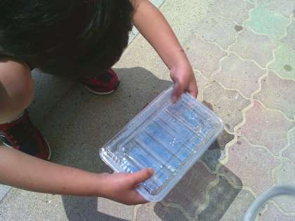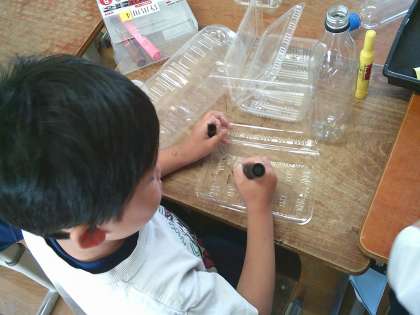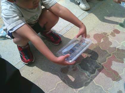 透明の容器にペンで色をつけ、水をいれて光にあて、地面にうつる模様を夢中で見ていました。