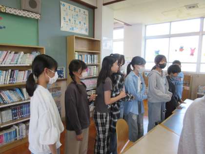 学校図書館の利用方法、本の探し方を司書の先生に教えていただきました。みんな、真剣に聞いていました。そのあとは、自分が読みたい本を探していました。