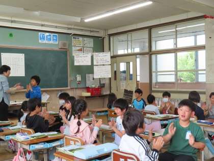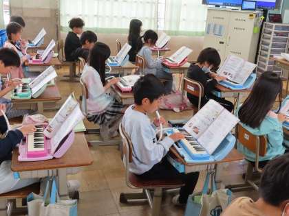 けんばんハーモニカの指運びが先週よりも上手になってきて、音色がそろっています。茶摘みの手拍子も楽しんでいます。