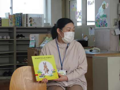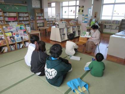 図書館司書の木曽先生に、「おねぼうさんはだあれ」という絵本の読み聞かせをしてもらいました。