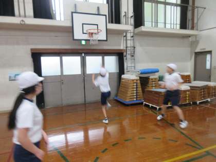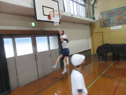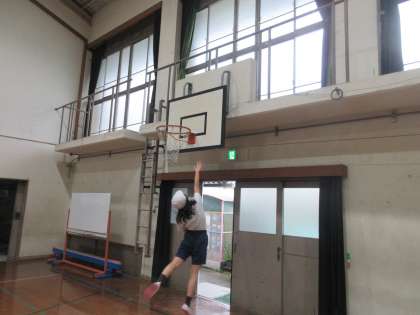 バスケットボールのゴールのボード板にタッチをします。しっかりと踏み込んでジャンプしました。
