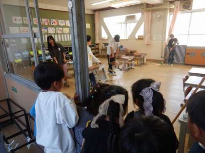 6年生が掃除をしてくれている様子を見学しました。自分たちでできることは少し手伝いました。本格的に掃除当番が始まったら、6年生に教えてもらいながら、自分たちで教室をきれいにします。