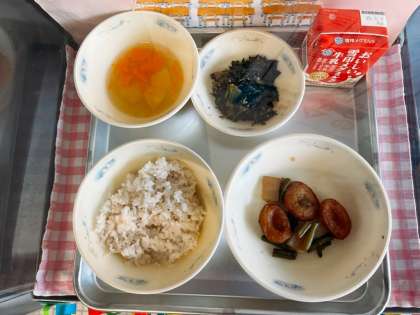 です。今日はフルーツ寒天のレシピを給食室前に展示しました。