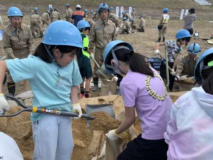 力を合わせて、土のう作りをしました。その後、水防団等による水防工法を見学しました。