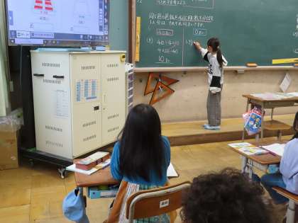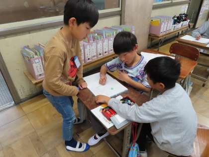 わり算の答えが、九九にないときの出し方を友だちと考え合っています。3年生の初めに学習した「九九の表」を思いだし、かける数だけ増えたり減ったりすることを活かし話し合いました。