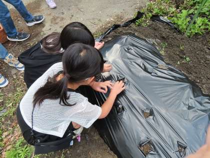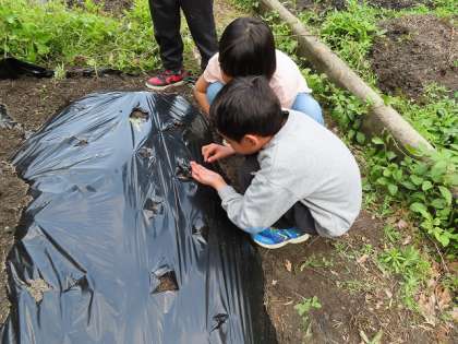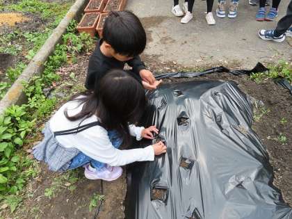 「ホウセンカ」は、土の上にそっと小さな種を載せて、薄く土をかぶせます。たねが転がらないように慎重に植えていました。