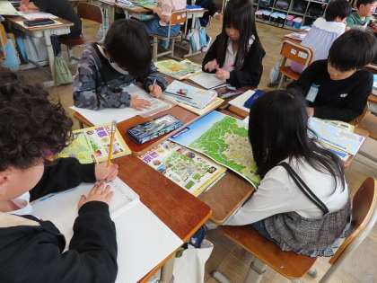 京都市の地図を開いて、分かることや、知っていることを話し合いました。「動物園は、京都市の東のほうにあるね。」「横大路運動公園や淀駅は南にあるね。」「京都水族館は、真ん中にある」など、見つけたことをたくさん話しています。