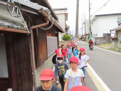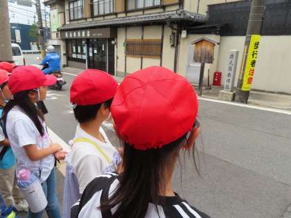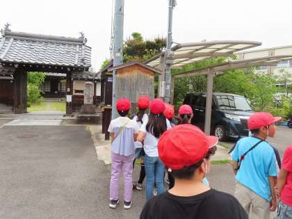 3年生の廊下からよく見えるお寺の「妙教寺」です。「ここにもたくさんのお墓があるね」行く途中には、「また、立札があったよ」「旧跡」の漢字は、淀小橋のところにもあったね」どういう意味だろう。「説明が、日本語・英語・韓国語だったよ」