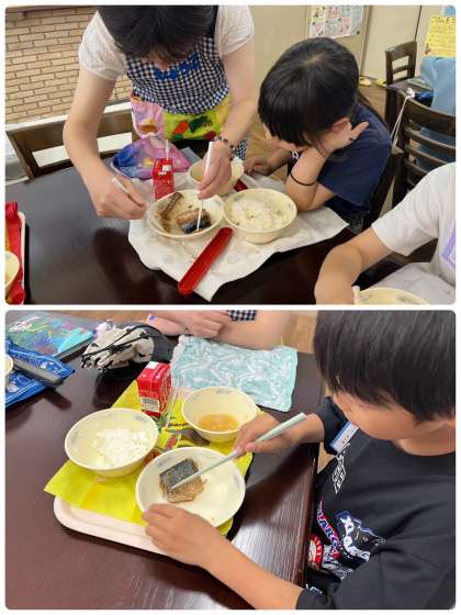 栄養教諭の北山先生に骨の取り方を教えてもらい、上手におはしを使いながらきれいに骨を取って食べていました。