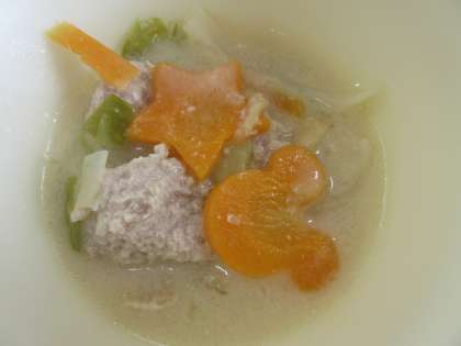 新献立「肉だんごの豆乳みそ煮」に、ミッキー型、星型、ハート型のハッピーキャロットが入っていました。