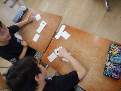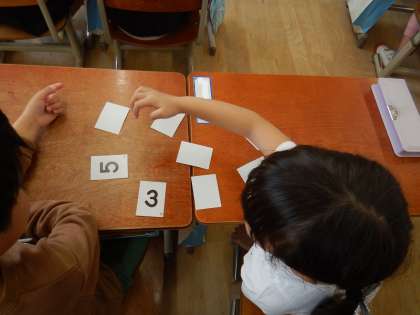 数カードを使って、めくって10をつくるゲームをしました。1枚目をめくった時に、「何が出たら10になるかな?」を考えてから2枚目をめくるルールでしました。いくつといくつで10になるかを素早く考えていました。