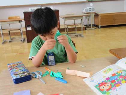 梅雨といえばどんなかざりを作ったらいいのか、考えながら折り紙を折りました!