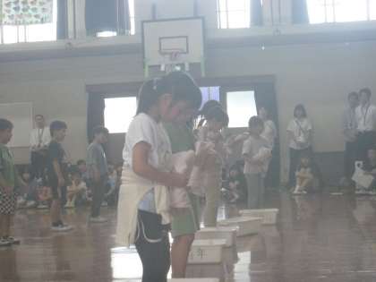 エプロンのたたみ方をかえうたに合わせて、披露しました。音楽にのって楽しそうに歌っていましたね。