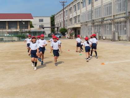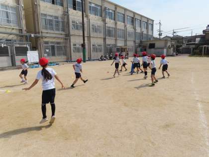 「走る」運動を意識して、アキレス腱を伸ばしながら大きく歩いたり、スキップやサイドステップなどをしたりして準備をしています。