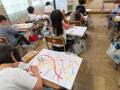 「この線が大きなタコに見えたから。」「たくさんの線が、海の中の昆布やわかめに見えるな。」「泳いでいる人も描こう」など、楽しんで描くことができました。
