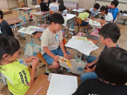 京都市の様子の学習で「お店やビルが集まっているところ」を調べました。社会科の副読本と四条烏丸付近の映像から分かったことや気が付いたことをまとめて、友だちと交流しています。行ったことがある児童に何をしに行ったかを話してもらうと、「買い物」答えが返ってきて百貨店や専門店がたくさん集まっていることを資料からも確認しました。
