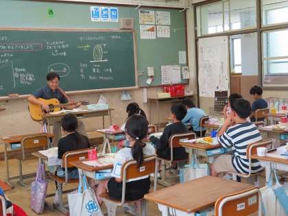給食の終わりに校長先生が歌を歌いに来てくださいました。久しぶりに校長先生の歌とギターを楽しみながら、給食をいただきました
