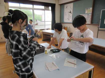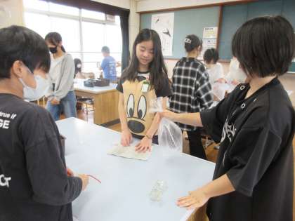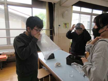 吐いた息を袋に吹き込んで、石灰水の色の変化を調べる実験をしました。