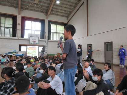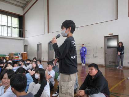 1年2組とひまわり学級の学級目標をきいて、全校児童の前で感想を伝えました。とても堂々と話していました。