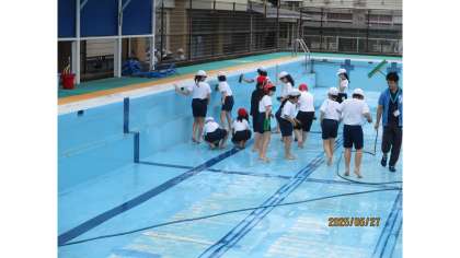 来週から始まる水泳学習に向けて、5・6年生でプール清掃を行いました。初めは、「嫌やなぁ」と言っていた子ども達ですが、毎年5・6年生が全校のみんなのために頑張って掃除をしてくれていることを伝えると、私たちも高学年になったから、「学校のみんなのために頑張ろう」という気持ちが芽生え、はりきって掃除に取り組んでいました。