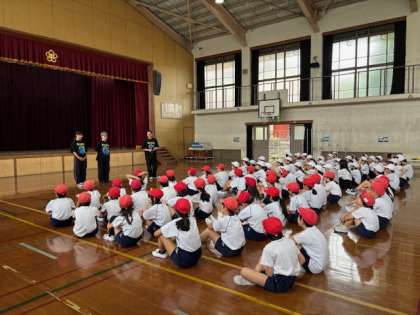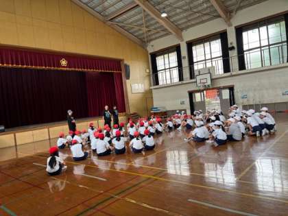 ジャンプロープ協会のゲストティーチャーを招き、ダブルダッチを見ました!プロの技を見て目をキラキラさせて話や演技を楽しむことができました。
