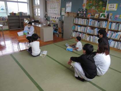 図書館司書の木曽先生に、「はしれ!おべんとう」という絵本の読み聞かせをしてもらいました。おかずたちが走り出す、とてもかわいいお話でしたよ。