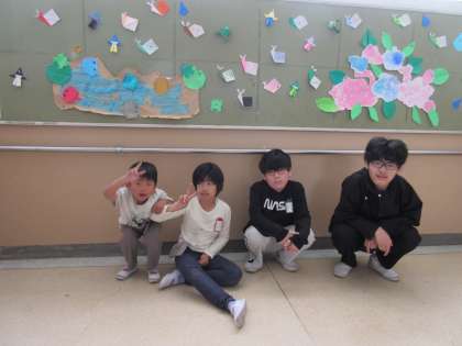カタツムリ、カエル、おたまじゃくし、小人、雨つぶ、あじさいなど、子どもたちが自由に作りました。