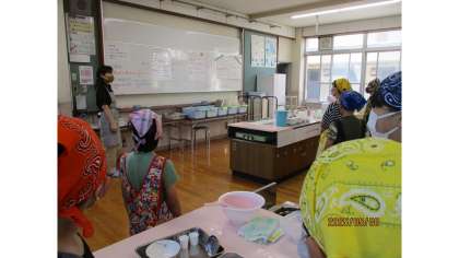 初めての、調理実習子ども達は、とても楽しみにしていました。初めに、調理実習をする上での注意事項を聞きました。