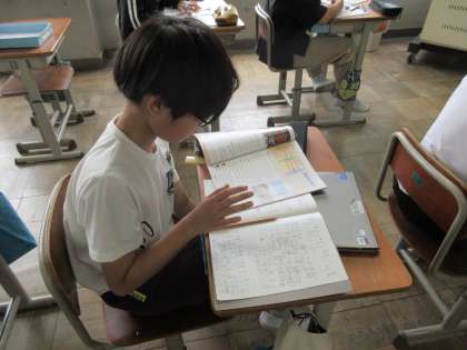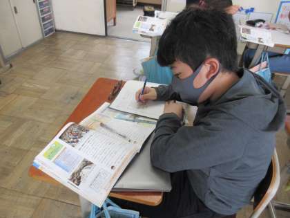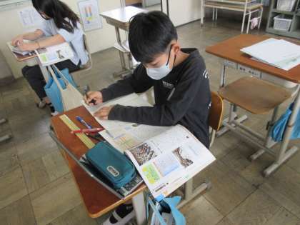 震災が起きた後から現在まで、国がどのような取り組みを行ったのかについて調べました。教科書から分かったことをノートにまとめています。