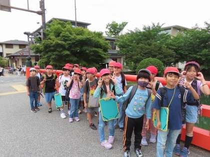 社会科の学習内容を自分の目で確かめるために京都市の様子を見に行きました。地下鉄の東山駅に降りしばらく歩くと写真や動画で見ていた大鳥居が、目の前に見えました。子どもたちからは、「あ、見えた」「大鳥居や」とその大きさに驚いていました。真下に来た時には、支柱の太さと、首が痛くなるほどの高さを実感しました。
