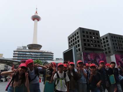 四条から地下鉄で京都駅に行きました。ニデック京都タワーを見上げ、駅前のバスターミナルの様子も見学しました。列になってターミナルに入ってくるバスの台数とバスに乗るために並んでいる観光客の長蛇の列に「すごい」「バスが17台目きた」などここでも初めての光景に驚いていました。 京都駅の最上階まで長いエスカレーターを乗り継ぎ、上がりました。