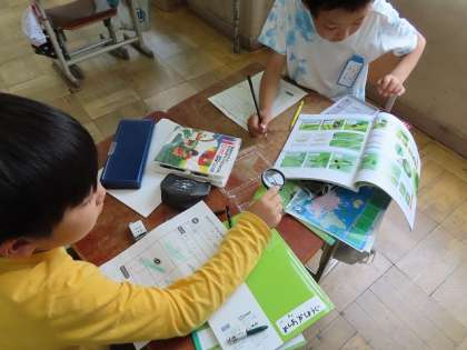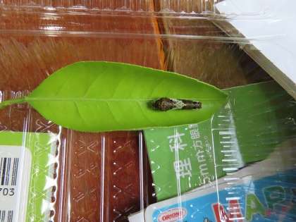 アゲハチョウの幼虫を観察しています。モンシロチョウの幼虫とは、色が全く違いますが、外敵から身をもまるために鳥のフンの色に擬態していることを話し合っていました。