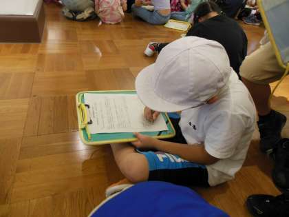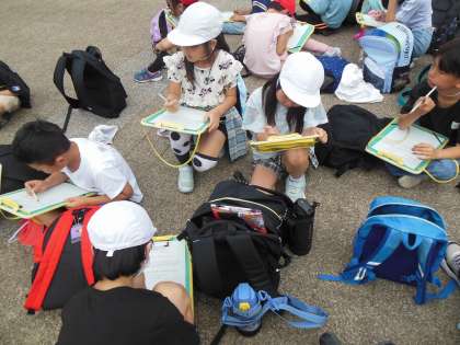「ここには何があったっけ?」「授業で習った大きい鳥居あったな」と、友だちと話しながら思い出して、一生懸命書いていました。