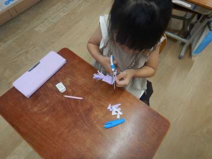 ハサミとのりを使って、七夕飾りになるような「流れ星」や「ちょうちん」、「貝かざり」を作りました。細かく切ったり丁寧に切ったりすると、思い通りの作品ができて、嬉しそうでした。