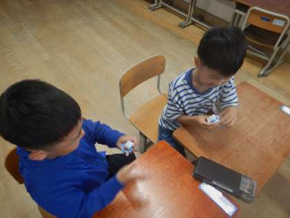 「たしざん」の学習で、けいさんカードを使って、問題を出したり答えたりする活動をしました。ブロックを使って確実に計算ができるようになったので、式と答えを言うことに慣れていきたいです。