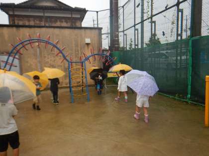 雨の日は、晴れの日とどんなことが違うのかを見つけに、校内を散歩しました。よく遊ぶ遊具の周りに大きな水たまりができていて、大興奮でした。飛んでいる虫はいないけれど、アメンボを見つけました。