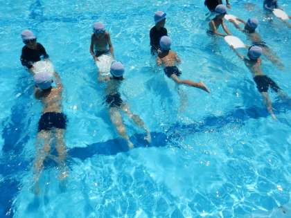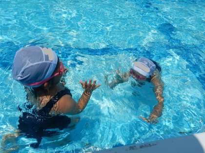 「水中じゃんけん」でペアの人と一緒に水にもぐって楽しんだり、体を浮かせたまま引っ張ってもらうことを楽しんだりしました。友達と一緒に活動することで、楽しめることが増えました。