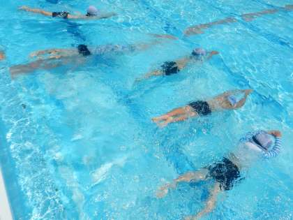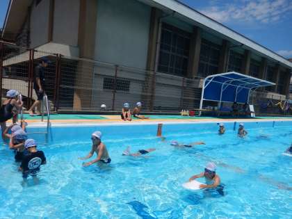 今まではプールの短い方の端から端までを移動することを楽しんでいましたが、25mのコースを使って、歩いたり浮いたりして進みました。「けのび」の姿勢を確かめたり、ペアで見合いっこしたりして、「けのび」が上手になってきました。