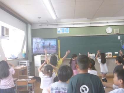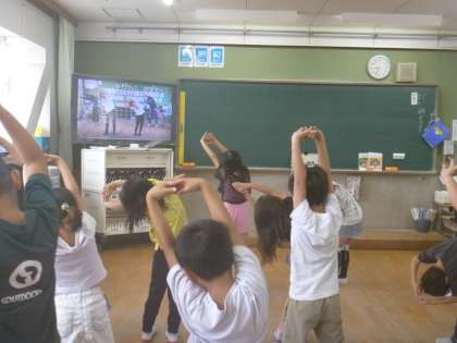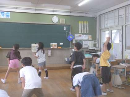朝の時間にみんなで楽しく体をほぐしています。元気な音楽にあわせて、先生たちのお手本を見ながら頑張っています!